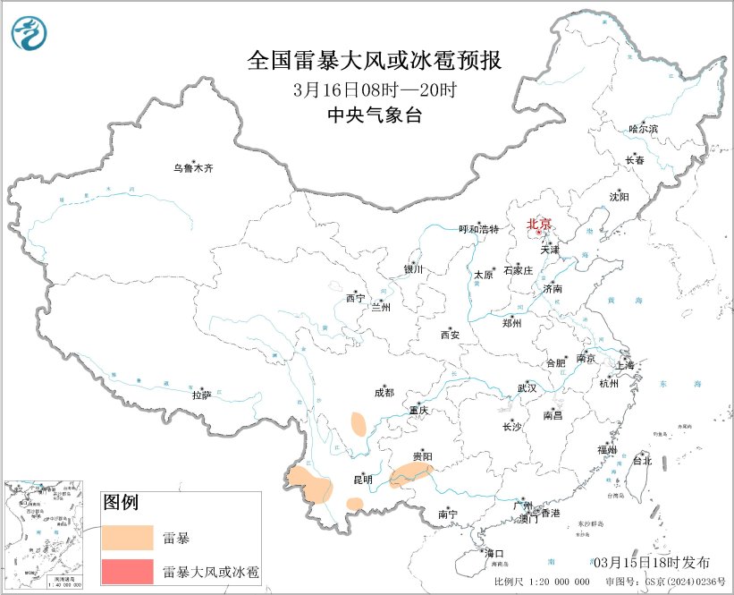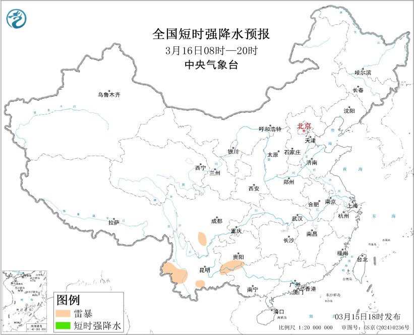 预计3月15日20时至16日20时,云南西南部、贵州中南部等地局地将有短时强降水天气,小时雨量20-30毫米。