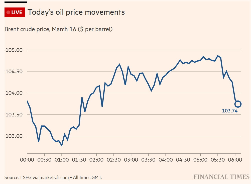 英国《金融时报》报道,3月16日,布伦特原油一度冲高至每桶106.50美元,随后回落至104.75美元。