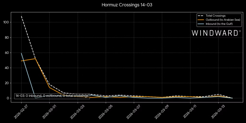海事数据分析服务公司“迎风公司”3月15日发布数据称,3月14日,霍尔木兹海峡双向通行量降至零,无船舶自动识别系统(AIS)信息可确认船只通过,较前一日下降100%,低于日均2.57艘的7日均值。